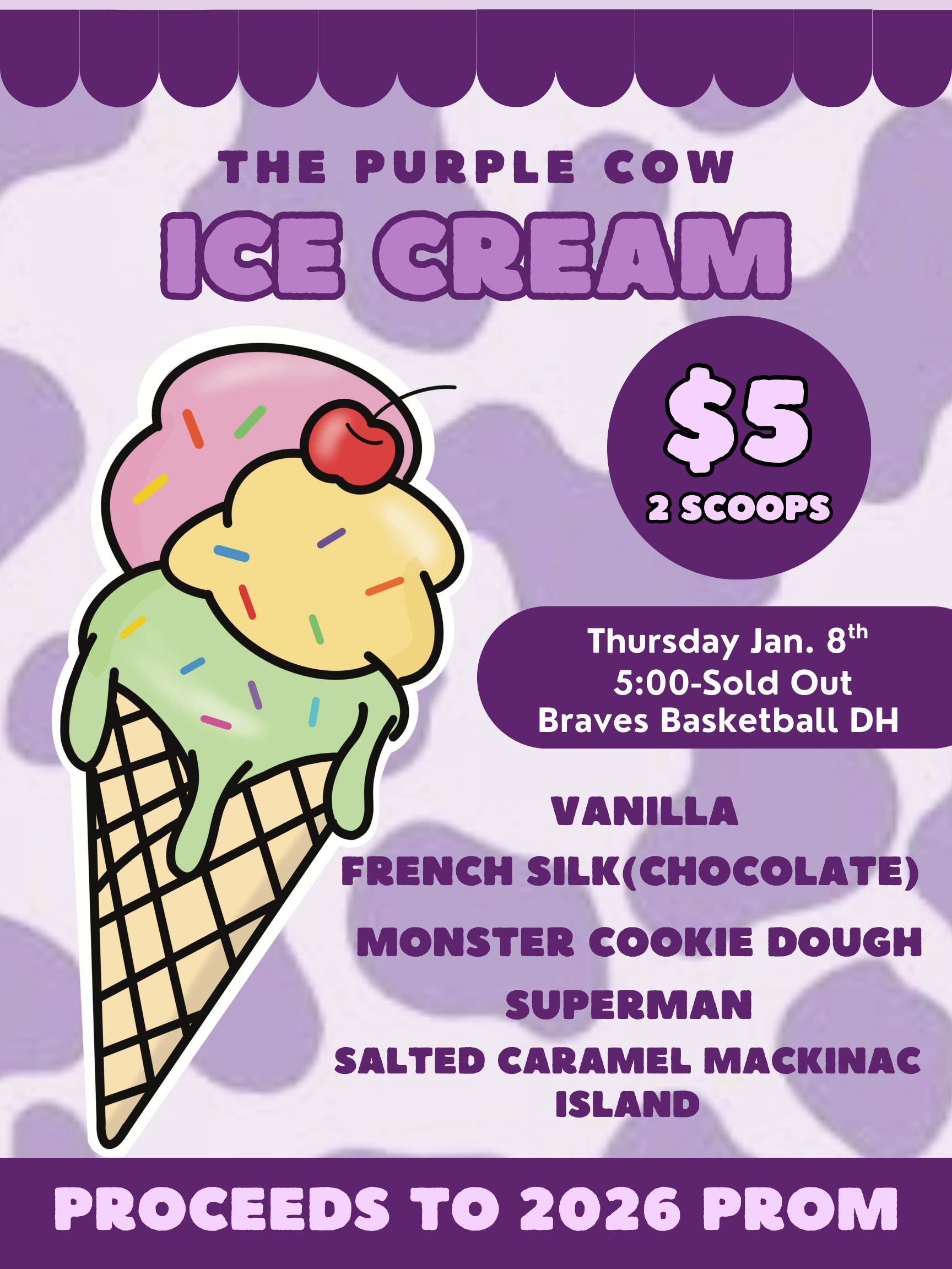 Looking for a fun way to support the Junior Class and the 2026 Prom? Come out to the Braves Basketball Doubleheader on Thursday, January 8, and treat yourself to delicious ice cream from The Purple Cow! Starting at 5:00 PM, you can grab two scoops for just $5—available until sold out. Choose from mouthwatering flavors like: